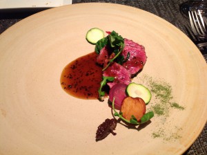安定のバルサミコ(とトリュフかな………………)のソースですが、手前右側の緑色の粉末は、長ネギの緑の部分をドライ・クラッシュしたものらしくコレがまた香りが良い!!本物のローストビーフってヤツを始めて食べた気がしました。